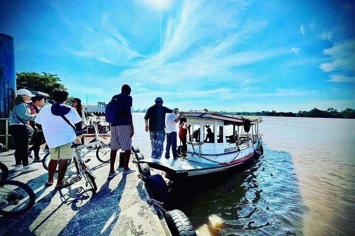 Pedal along raised concrete lanes as birdsong echoes from mangroves and banana groves. Wooden ferries splash at the pier while the scent of grilled noodles drifts across still canals and lizards bask on sun-dappled roots.